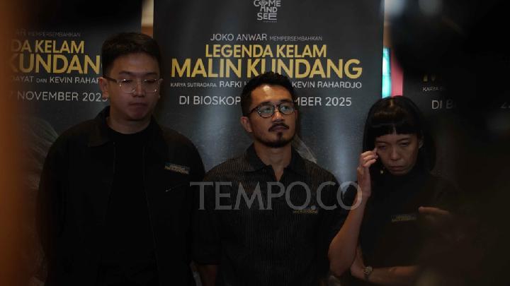 Sutradara dan penulis film Legenda Kelam Malin Kundang, Kevin Rahardjo (kiri), Rafki Hidayat dan Aline Djayasukmana pada konferensi pers dan screening film di Epicentrum XXI, Kuningan, Jakarta, 17 November 2025. Tempo/Magang/Kemal Raditya Pasha