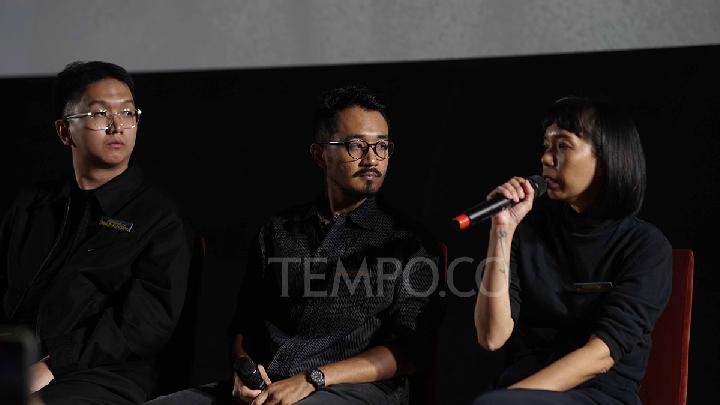 Pendiri Rumah Produksi Come and See Pictures, Tia Hasibuan (kiri) dan Joko Anwar pada konferensi pers dan screening film di Epicentrum XXI, Kuningan, Jakarta, 17 November 2025. Tempo/Magang/Kemal Raditya Pasha