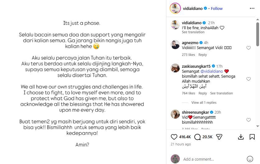 “Kita semua mempunyai perjuangan dan tantangan masing-masing dalam hidup. Aku memilih untuk berjuang, untuk lebih mencintai diriku sendiri, dan untuk melindungi apa yang telah Tuhan berikan kepadaku,” tulis Vidi dalam unggahannya.